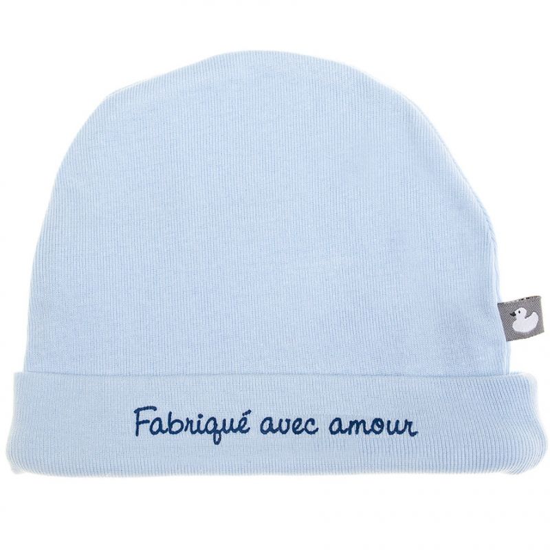Bonnet de naissance Fabriqué avec amour bleu ciel