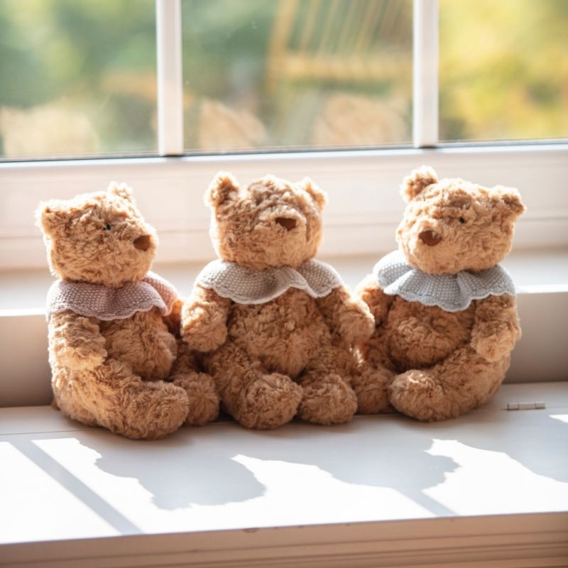 Avec sa fourrure moelleuse couleur caramel et son élégant col tricoté, cet adorable ourson évoque les souvenirs des jouets d’antan tout en apportant une touche de douceur et de raffinement à la chambre de bébé. À la fois doudou et objet déco, il deviendra vite un incontournable du quotidien.