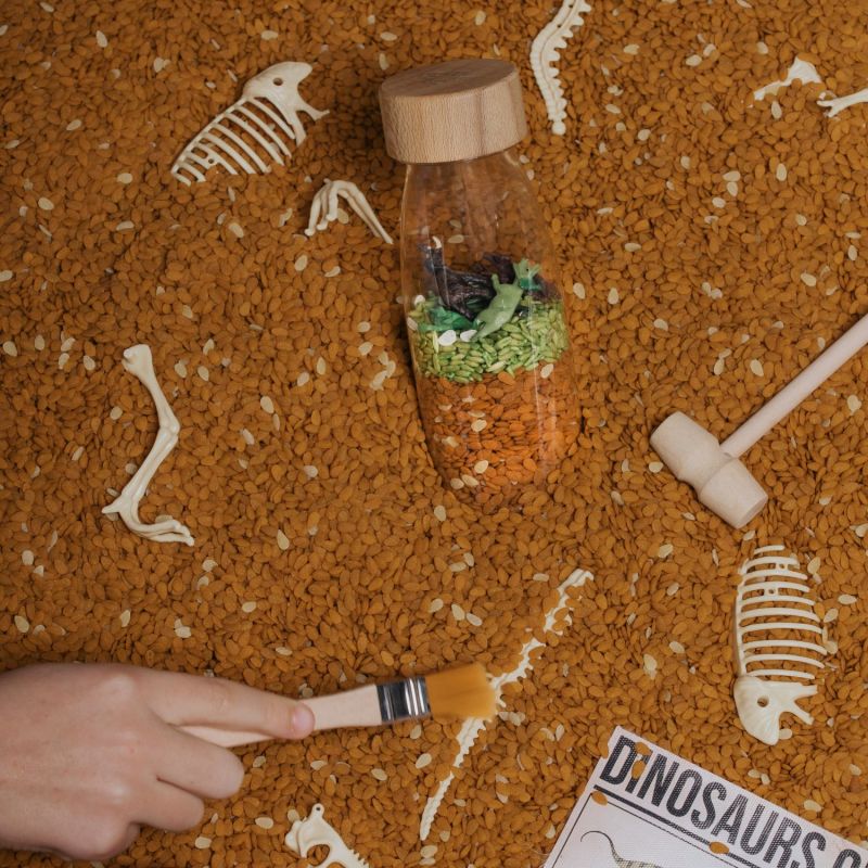 Fabriquées à partir de plastique recyclable et d'éléments naturels comme le riz haché et des grains de maïs, les bouteilles sensorielles respectent les normes européennes et peuvent être manipulées et mâchouillées en toute sécurité. Elles sont incassables et parfaitement scellées grâce à un système de double bouchon.